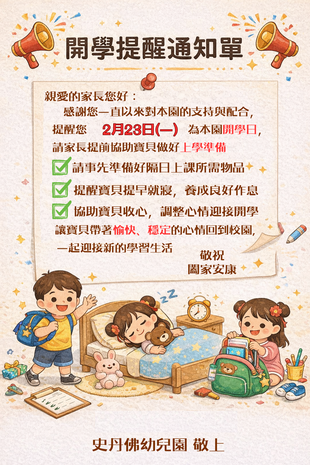 親愛的家長您好:感謝您一直以來對本園的支持與配合,提醒您 2月23日(ㄧ)為本園開學日,請家長提前協助孩子做好上學準備: